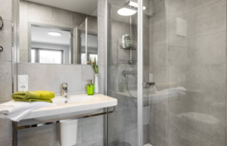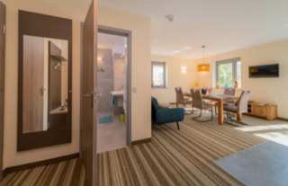 Diese Apartments ohne Küche mit Doppelbett (140 cm breit) im Wohnbereich verfügen über ein angenehmes LED-Leuchtkonzept. Die geräumigen Bäder sind mit flacher Dusche (Glasduschwände), Handtuchheizkörper, großen Waschtisch und Fön ausgestattet.