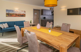 Das großzügige Apartment mit voll ausgestatteter Küche und 2 Schlafzimmern (ab 7-Gäste-Belegung) mit Stockbetten für Erwachsene, für jeweils max. 6 Gäste verfügt über einen großen Ess-/Aufenthaltsbereich.