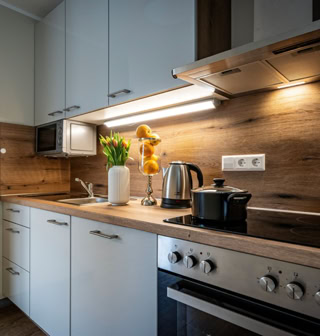 Flat-TV, W-LAN, Küche mit Kühlschrank, Geschirrspüler, Herd, Mikrowelle, Kaffeemaschine, Wasserkocher