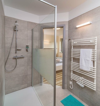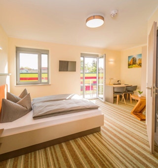 Diese Apartments ohne Küche mit Doppelbett (140 cm breit) im Wohnbereich verfügen über ein angenehmes LED-Leuchtkonzept. Die geräumigen Bäder sind mit flacher Dusche (Glasduschwände), Handtuchheizkörper, großen Waschtisch und Fön ausgestattet. Sie gelangen barrierefrei vom Parkplatz (direkt am Hostel) bis zu Ihrem Apartment mit sonnigem Balkon bzw. Terrasse
