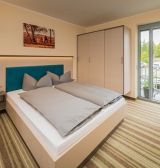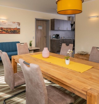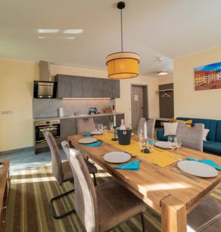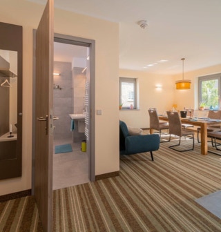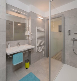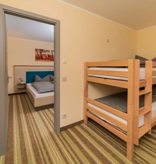 The modern spacious apartment with fully equipped kitchen and 2 bedrooms (1 bedroom with double bed, 1 bedroom with bunk bed, sofa bed in the living room). It has a pleasant LED lighting concept. The spacious bathroom is equipped with a flat shower (glass shower walls), towel radiator, large washbasin and hairdryer. The elevator takes you barrier-free from the parking lot (directly in front of the hostel) to your apartment with sunny balcony.