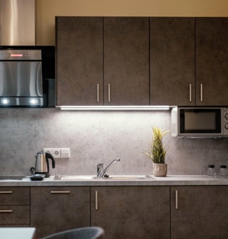 The modern apartment with kitchen and double bed in the living area. It has a pleasant LED lighting concept. The spacious bathroom is equipped