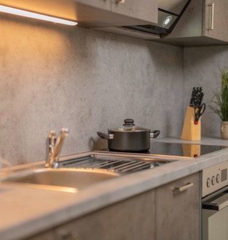 The modern spacious apartment with fully equipped kitchen and 2 bedrooms (1 bedroom with double bed, 1 bedroom with bunk bed, sofa bed in the living room). It has a pleasant LED lighting concept. The spacious bathroom is equipped with a flat shower (glass shower walls), towel radiator, large washbasin and hairdryer. The elevator takes you barrier-free from the parking lot (directly in front of the hostel) to your apartment with sunny balcony.